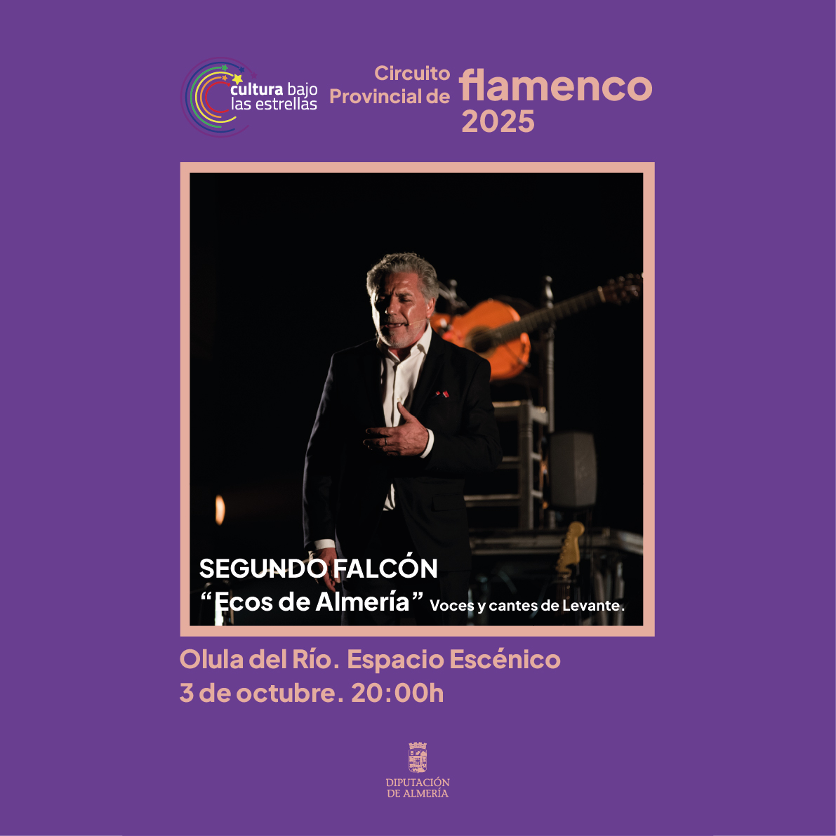 Este proyecto rinde homenaje a los grandes cantaores de Almería y a los cantes de levante, figuras legendarias de cantaores como El Ciego de la Playa o Pedro el Morato. El espectáculo explora los cantes mineros y de levante, la malagueña de Chacón, la soleá y los tarantos que cobran vida en un recorrido sonoro y visual por el alma del flamenco almeriense. La guitarra flamenca de David de La Fragua, fiel a las tonalidades y afinaciones tradicionales, acompaña a los cantes interpretados por Segundo Falcón. “Ecos de Almería” no solo rescata el legado de estos grandes maestros, sino que también reivindica la importancia de Almería en el desarrollo del flamenco, poniendo en valor su singularidad dentro de legado flamenco andaluz.